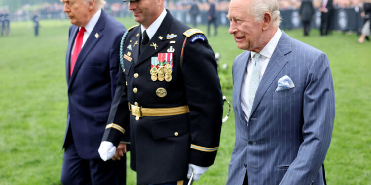 Under gray, drizzly skies, Trump welcomed Charles and Queen Camilla to the White House in a ceremony on the South Lawn, with the president quipping that it was a “beautiful British day.” The king shook hands with members of Trump’s Cabinet and joined the president for a rendition of the national anthem.