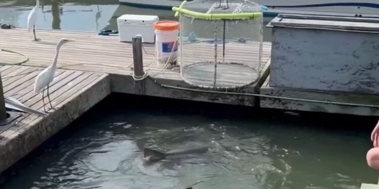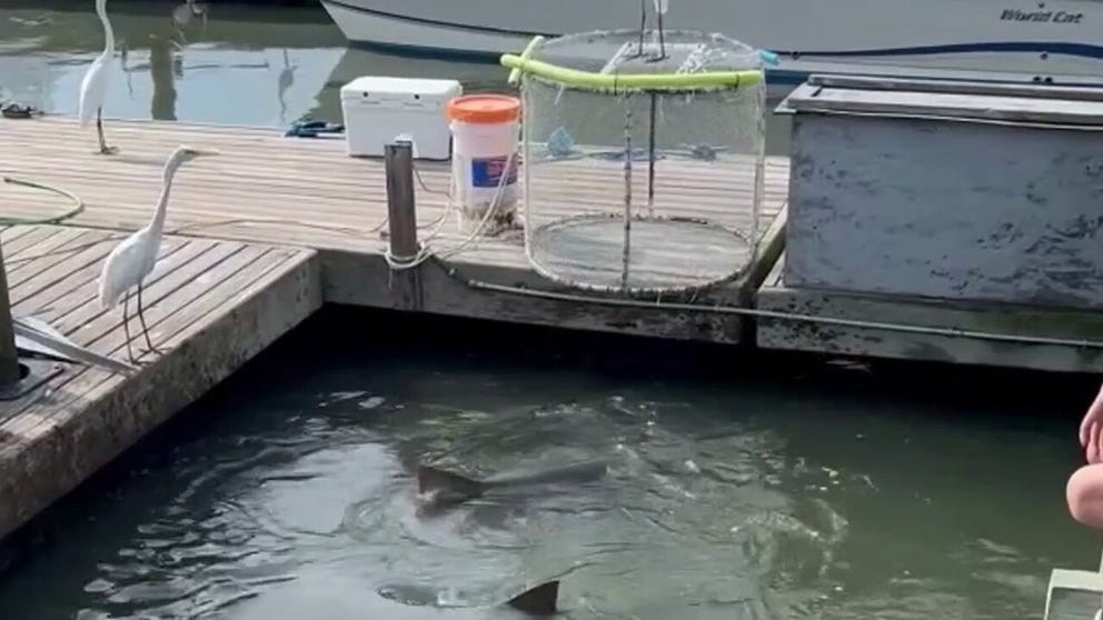 In Athans’ video, the alligator can be seen gliding through the water near the docks, while the fins of multiple sharks surfaced nearby.
