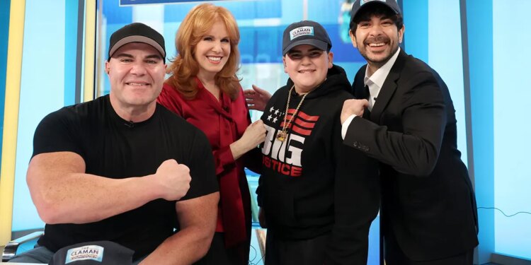 A.J., Liz Claman, Big Justice, and Tony Khan pose on The Claman Countdown preceding the 2024 Fox News All-American Christmas Tree Lighting at FOX Square on Nov. 22, 2024 in New York City. (Michael Loccisano/Getty Images)