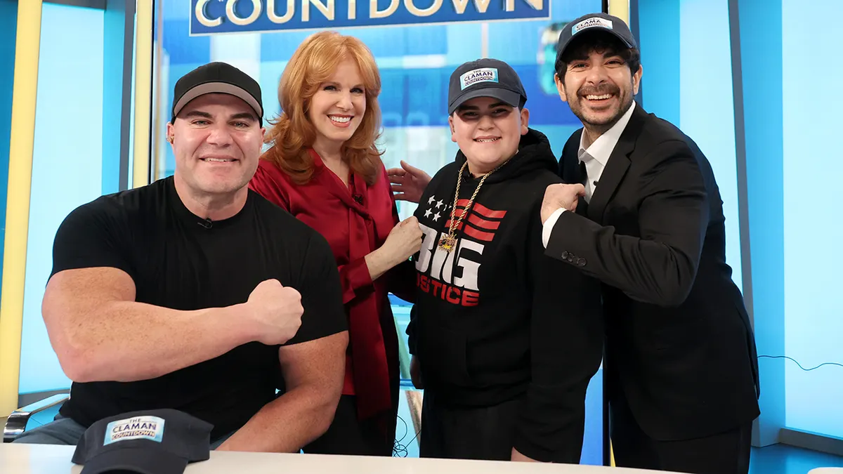A.J., Liz Claman, Big Justice, and Tony Khan pose on The Claman Countdown preceding the 2024 Fox News All-American Christmas Tree Lighting at FOX Square on Nov. 22, 2024 in New York City. (Michael Loccisano/Getty Images)