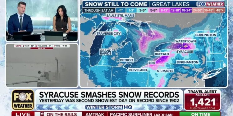 The FOX Forecast Center said snow totals downwind of Lake Ontario could approach three feet near the Tug Hill Plateau in upstate New York by Saturday morning.