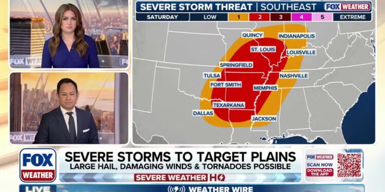 The extreme weather threat is then expected to shift eastward into the lower and mid-Mississippi Valley on Saturday evening and night.