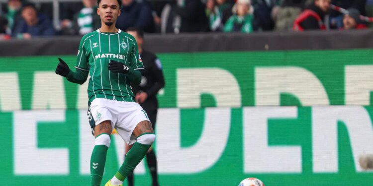 Justin Njinmah of Werder Bremen controls the ball during the Bundesliga match between Werder Bremen and FC Bayern München on Feb. 14, 2026, in Bremen, Germany. (Oliver Kaelke/DeFodi Images/DeFodi via Getty Images)