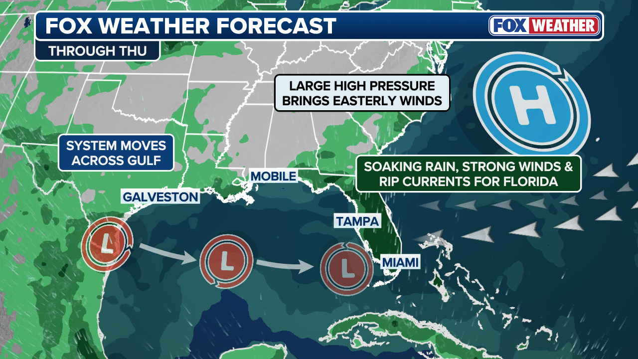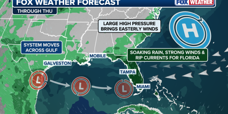 Heavy rain is expected to soak parts of the southern U.S. this week as a storm system moves across the Gulf of America, bringing wet weather, strong winds, and rip currents to Florida.