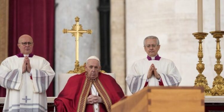 Pope Francis sits by the coffin of late Pope Emeritus Benedict XVI in St. Peter’s Square during a funeral mass at the Vatican, on Jan. 5, 2023. (AP Photo/Andrew Medichini, File)