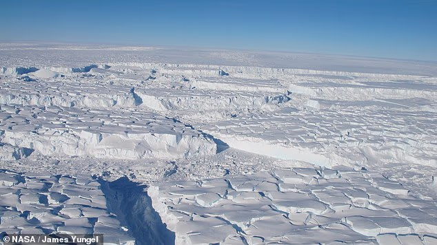 This photograph shows the Thwaites ice shelf – the widest glacier on the planet. It spans an area equal to the island of Great Britain (file image)