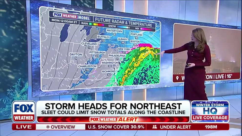 Winter weather will likely persist in the Northeast, including New York City and Philadelphia, as the storm wraps up, with the potential for snow to linger across portions of New England into Monday evening as the area of low pressure pulls away from the coast.