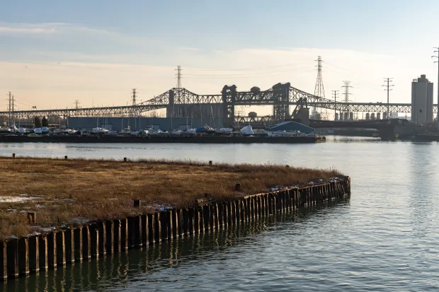 The Chicago Skyway Toll Bridge, a common path for Chicagoans to travel to Indiana, shown from South Ewing Avenue in South Chicago on Dec. 17, 2025. (Dominic Di Palermo/Chicago Tribune)