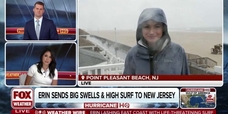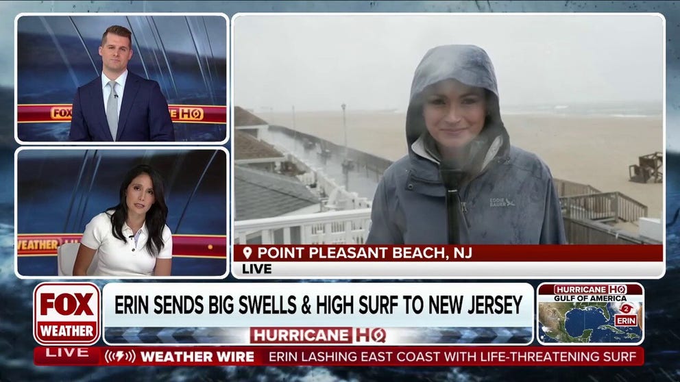 Meteorologist Britta Merwin reports from the Point Pleasant Boardwalk in New Jersey where beaches are closed ahead of Hurricane Erin. The hurricane is forecast to bring the biggest waves to the Jersey shore beginning Thursday.