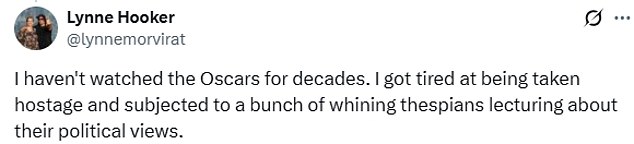 ‘I haven’t watched the Oscars for decades. I got tired at being taken hostage and subjected to a bunch of whining thespians lecturing about their political views,’ one person wrote on X.
