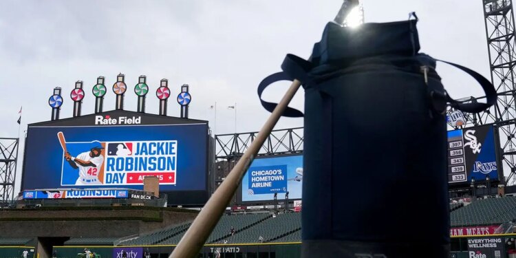 The big screen at Rate Field announced “Jackie Robinson Day” before a baseball game between the Tampa Bay Rays and Chicago White Sox in Chicago on April 15, 2026. (Erin Hooley/AP)