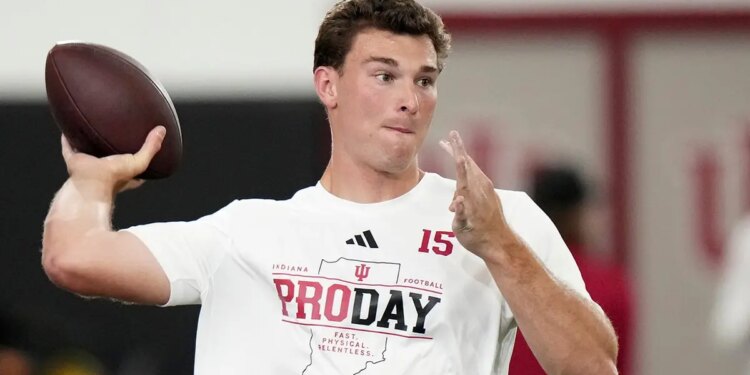 Indiana quarterback Fernando Mendoza looks to throw a pass during the school’s NFL pro day in Bloomington, Indiana, on April 1, 2026. (AJ Mast/AP Photo)