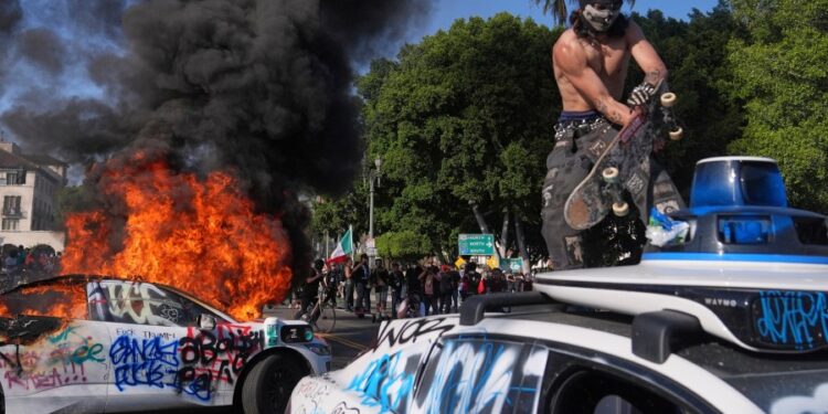 The night of June 9 also devolved into a stretch of five Waymo driverless taxis on North Los Angeles Street near Arcadia Street tagged with graffiti and lit on fire, sending flames and clouds of toxic black smoke into the air.