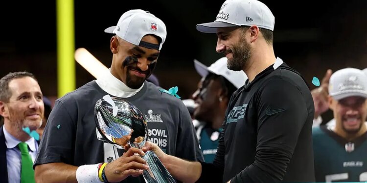 Philadelphia Eagles quarterback Jalen Hurts (1) and Philadelphia Eagles head coach Nick Sirianni celebrate with the Vince Lombardi Trophy after defeating the Kansas City Chiefs in Super Bowl LIX at Caesars Superdome. (Mark J. Rebilas/Imagn Images)