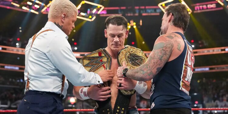 Cody Rhodes and CM Punk present John Cena with the Undisputed WWE Championship and the World Heavyweight Championship during Saturday Night’s Main Event at Capital One Arena in Washington, D.C., on Dec. 13, 2025. (Rich Freeda/WWE)