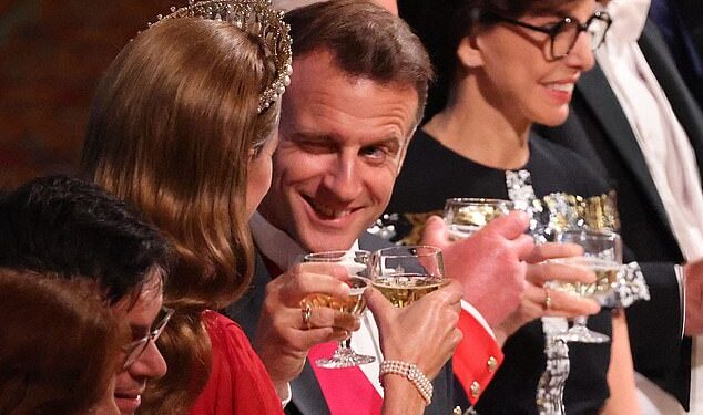 Emmanuel Macron winked as he clinked glasses with the Princess of Wales at last night’s state banquet