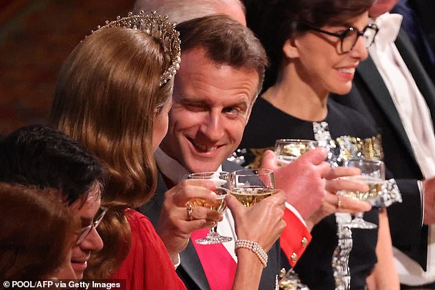 Emmanuel Macron winked as he clinked glasses with the Princess of Wales last night