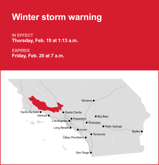 5 Freeway corridor near Santa Clarita, Santa Barbara County Interior Mountains and Southern Ventura County Mountains are under a winter storm warning which was released by the National Weather Service on Thursday at 1:13 a.m. The warning is in effect until Friday Feb. 20, at 7 a.m.