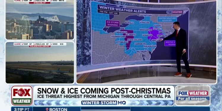 A quick but impactful shot of snow and ice will blast through the Northeast Friday into early Saturday and significantly impact post-Christmas travel, as over 60 million Americans face winter weather alerts from Philadelphia through New York City. FOX Weather Meteorologist Ian Oliver breaks down the storm that could throw a wrench in your post-Christmas travel plans.