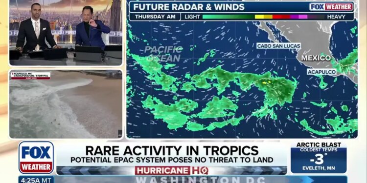 The FOX Forecast Center is monitoring the rare potential for tropical activity in the eastern Pacific. While the system is unlikely to intensify beyond a depression and poses no threat to land, its formation would be historic. Since record-keeping began in 1850, there has never been a tropical cyclone recorded in this basin during January.