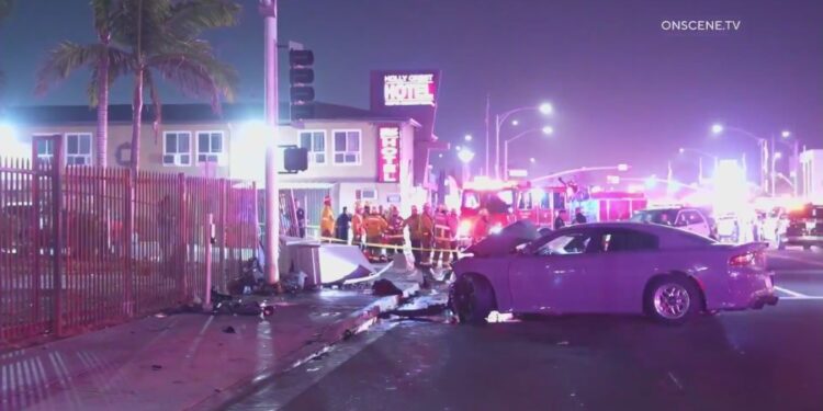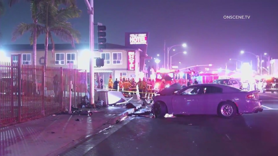 Video from the scene obtained by KTLA shows a Dodge Charger speeding down the street before it crashed and sustained significant damage. L.A. County Fire Department officials could not immediately provide a cause for the crash or details surrounding the identity of the driver; however, it is believed they were injured.