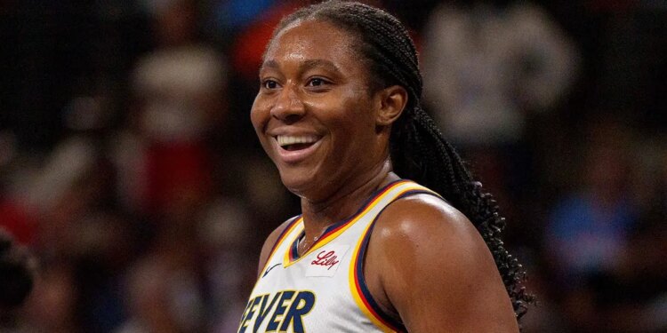 Aliyah Boston smiles on the court during Game 3 of the first round of the WNBA playoffs between the Indiana Fever and Atlanta Dream at Gateway Center Arena in College Park, Georgia, on Sept. 18, 2025. (Andrew J. Clark/ISI Photos via Getty Images)