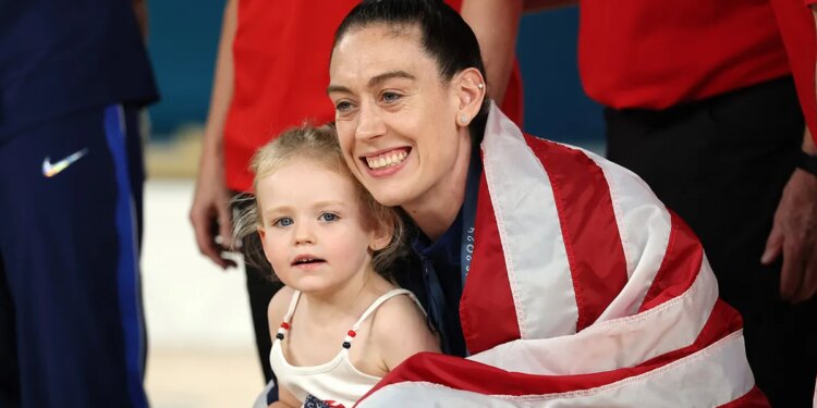 Breanna Stewart of Team United States celebrates with her child during the Women’s basketball medal ceremony on day sixteen of the Olympic Games Paris 2024 at Bercy Arena on Aug. 11, 2024 in Paris, France. (Elsa/Getty Images)