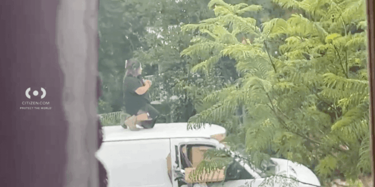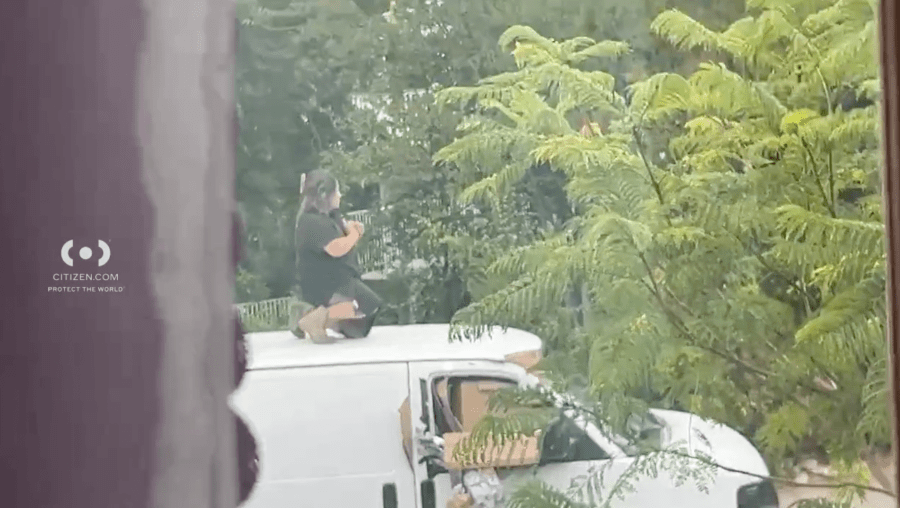 • Video posted to the Citizen App shows a woman involved in a pursuit and standoff standing and then kneeling on top of the van before laying down on her chest. May 26, 2025.