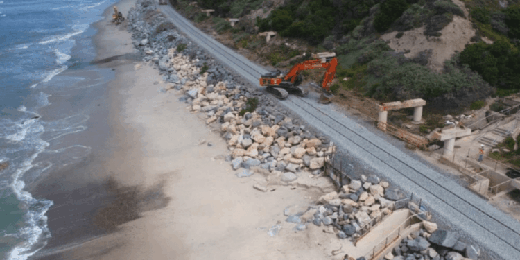 “The riprap is being strategically sorted and placed primarily within the area where riprap previously existed to fortify the track and protect against coastal erosion,” OCTA officials wrote in the latest construction update.