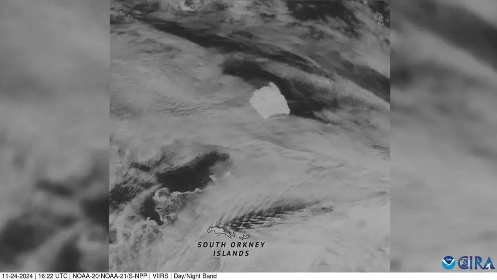 NASA photos taken on Dec. 26, 2025 and Dec. 27, 2025, show the colossal iceberg with striations of blue coloring on parts of its surface.
