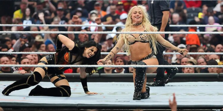 Liv Morgan kicking Stephanie Vaquer during a wrestling match at Allegiant Stadium