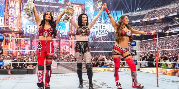 Brie Bella and Paige celebrate their win with Nikki Bella during WrestleMania 42: Night 1 at Allegiant Stadium in Las Vegas, Nev., on April 18, 2026. (Rich Freeda/WWE)