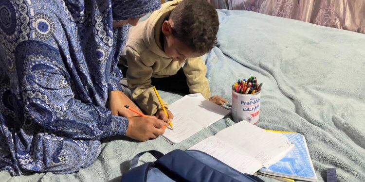 Nuseirat, Gaza Strip – Nibal Abu Armana sits in her tent, where she has been teaching her seven-year-old son, Mohammed, basic literacy and numbers.