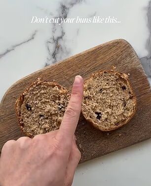 ‘The hack you need in your life!’ they wrote. ‘We love cutting our buns this way so we have more surface area to slather on our butter.’