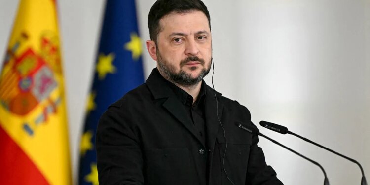 Ukraine’s President Volodymyr Zelensky gives a joint press conference with Spain’s Prime Minister at the Moncloa Palace in Madrid on March 18, 2026. (Javier SORIANO / AFP via Getty Images)
