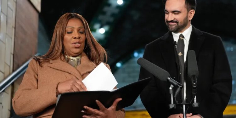 The private ceremony, administered by New York Attorney General Letitia James, a political ally, took place at the old City Hall station, one of the city’s original subway stops that is known for its stunning arched ceilings.